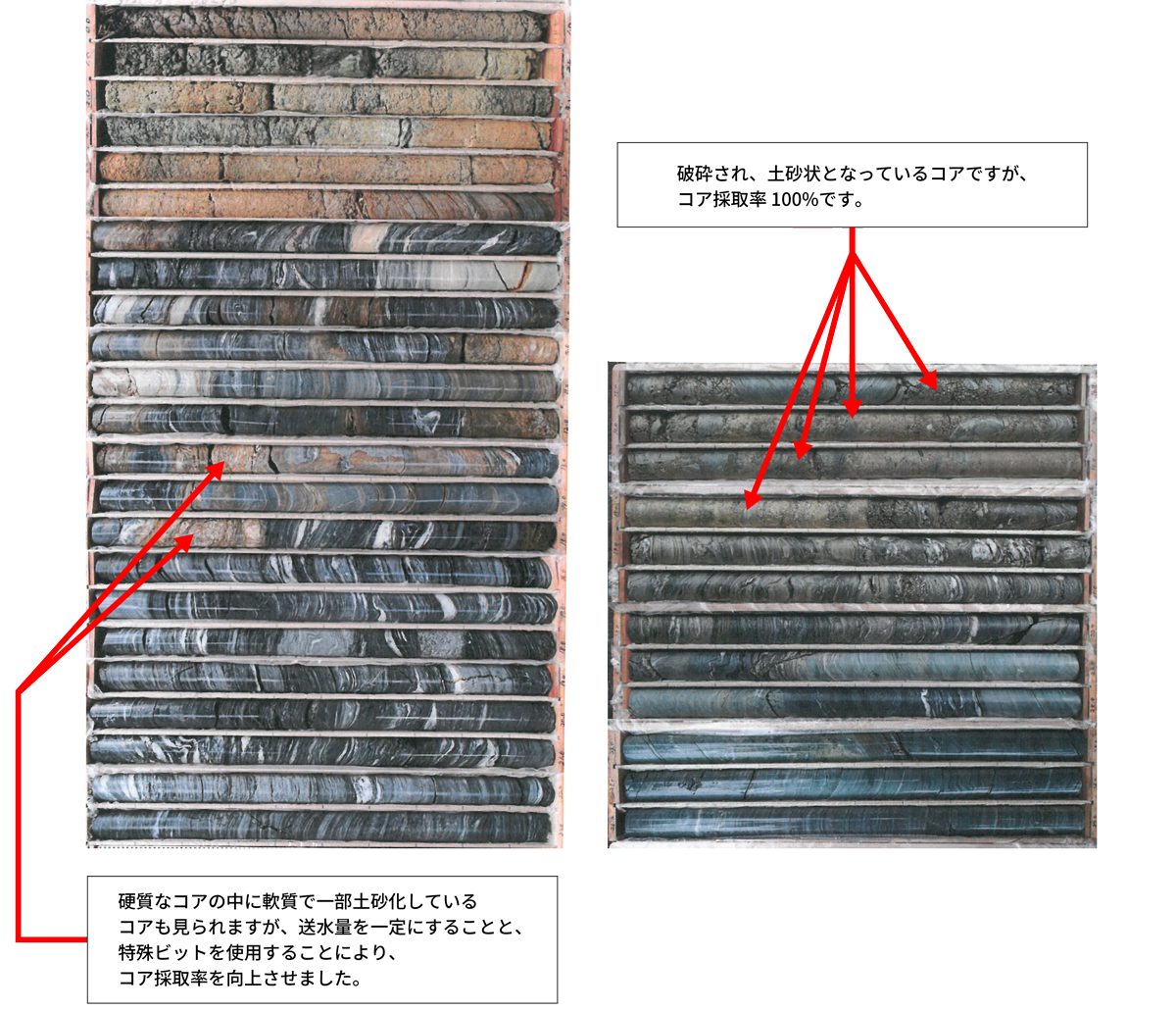 ボーリングコアを採取する技術は、各社が工夫していますが、当社においても数々の工夫を行っています。